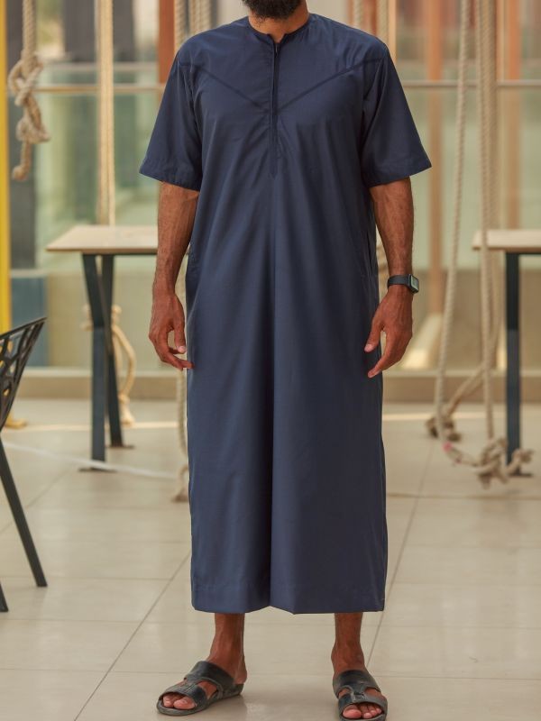 Qamis de manga curta em algodão dos Emirados, azul-marinho